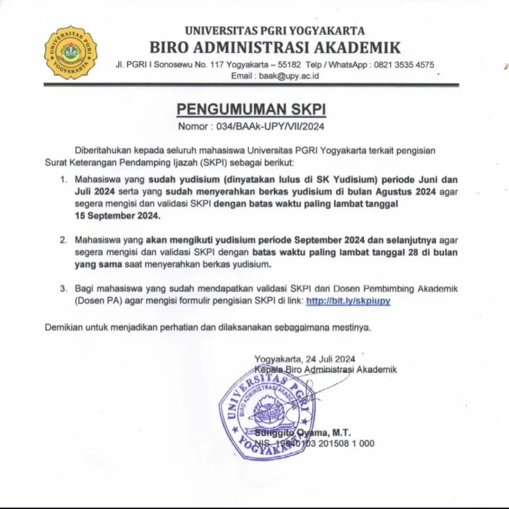 Kami ingin menginformasikan bahwa Surat Keterangan Pendamping Ijazah (SKPI) kini telah tersedia. SKPI adalah dokumen resmi yang mendampingi ijazah Anda dan berisi informasi penting tentang pencapaian akademik dan non-akademik selama Anda menempuh studi di universitas kami.